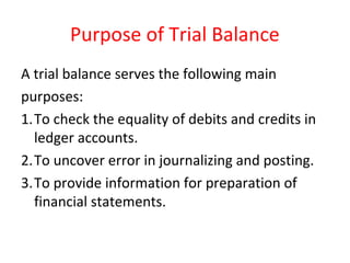 The following are some of the important objectives of trial balance. In general the trial balance.